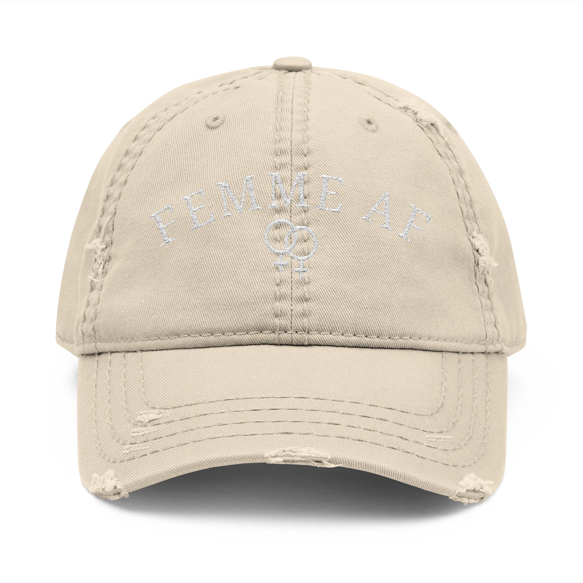Make a statement without saying a word. The Femme AF distressed dad hat is embroidered with pride and attitude, the perfect mix of subtle style and unapologetic identity.